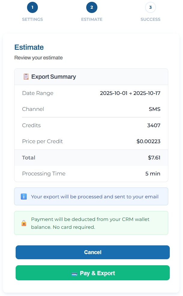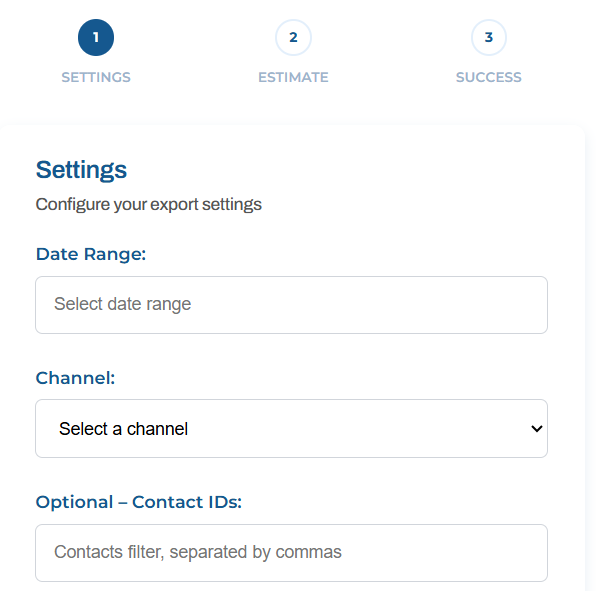 Here you can choose the date up to be exported, the communication channel and some optional contact ID tags