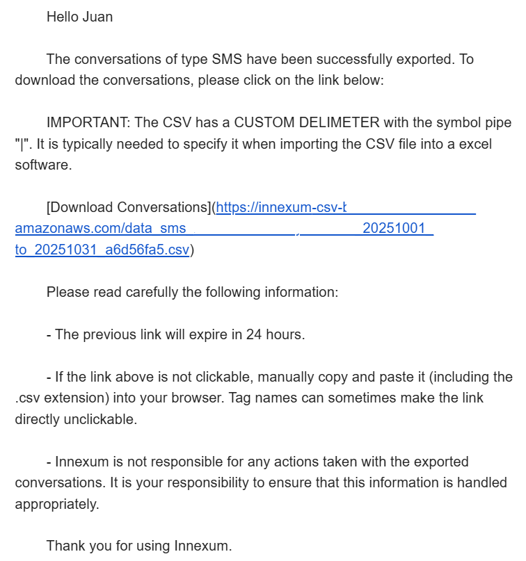 After the export process has ended, an email will arrive with the information